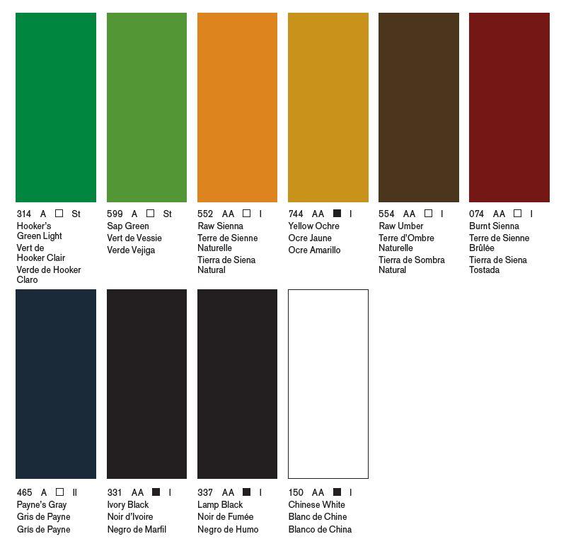 Акварель «Cotman» представлена палитрой из 40 различных цветов. Выпускается в сухом виде – в кюветах и в полутвёрдом – в тюбиках по 8 мл и дополнительно основные цвета по 21 мл. Поскольку акварель в тюбиках мягкая и выдавливается на палитру, художнику легче регулировать требуемое количество краски.